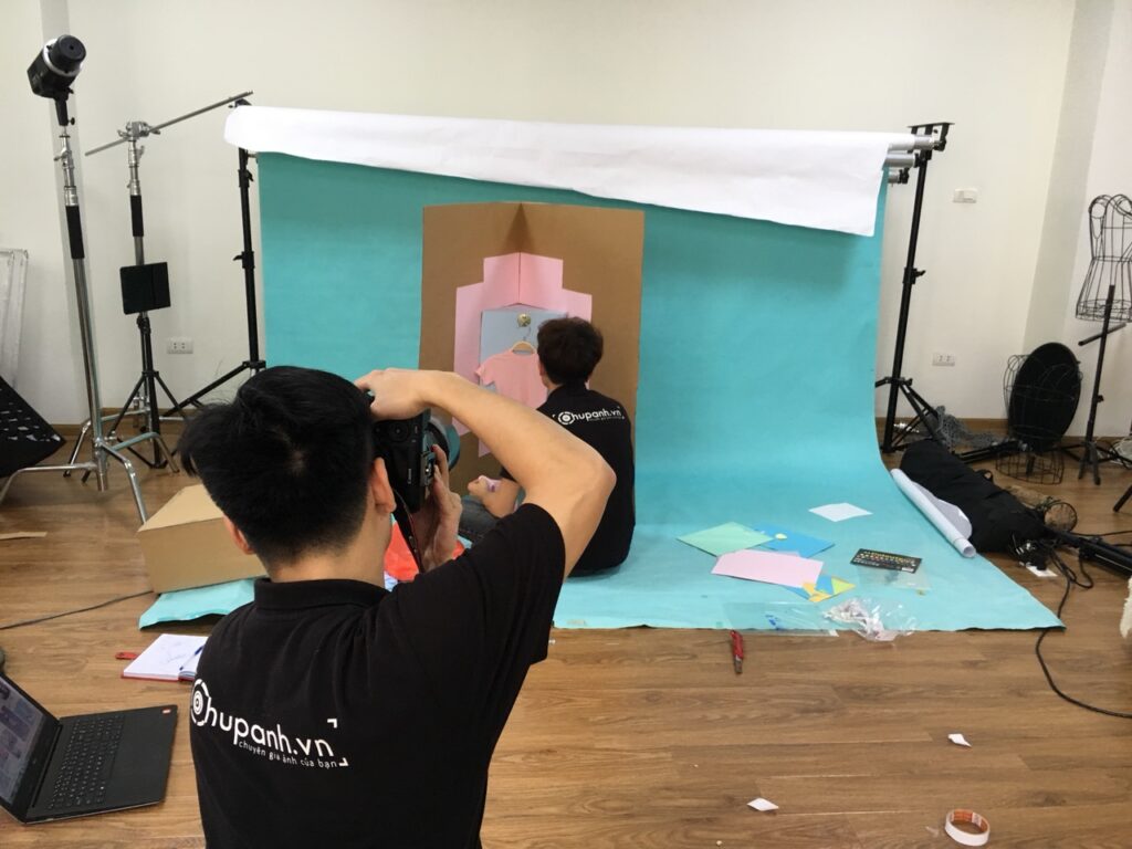 tiến hành setup bối cảnh, stlyist, concept và chụp tiền kỳ, chụp nhiều góc khác nhau để lựa chọn
